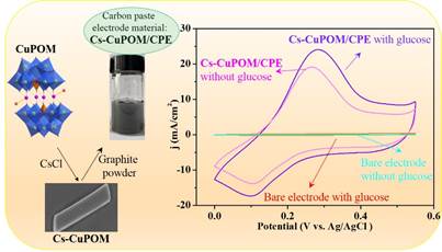 近日,我院曹新华教授课题组在无机化学领域知名期刊《Inorganic Chemistry》上发表了题为“Nanostructured Polyoxometalate-Based Heterogeneous Electrode Materials for Electrochemical Sensing of Glucose”(DOI:10.1021/acs.inorgchem.3c04596)的研究成果。该研究选用CsCl对水溶性K2Na8[Cu4(H2O)2(PW9O34)2](CuPOM)进行抗衡阳离子交换,得到形貌为光滑棒状的不溶性化合物CuPOM(Cs-CuPOM),再利用Cs-CuPOM对碳糊电极进行修饰(Cs-CuPOM/CPE),构建了电化学葡萄糖传感器。与Cs-MnPOM、Cs-FePOM及其它已报道的POMs基电极材料相比,Cs-CuPOM具有更快的电子传递动力学,展示出更高的电化学传感器活性,该项工作为开发高性能的葡萄糖传感器提供了理论参考。