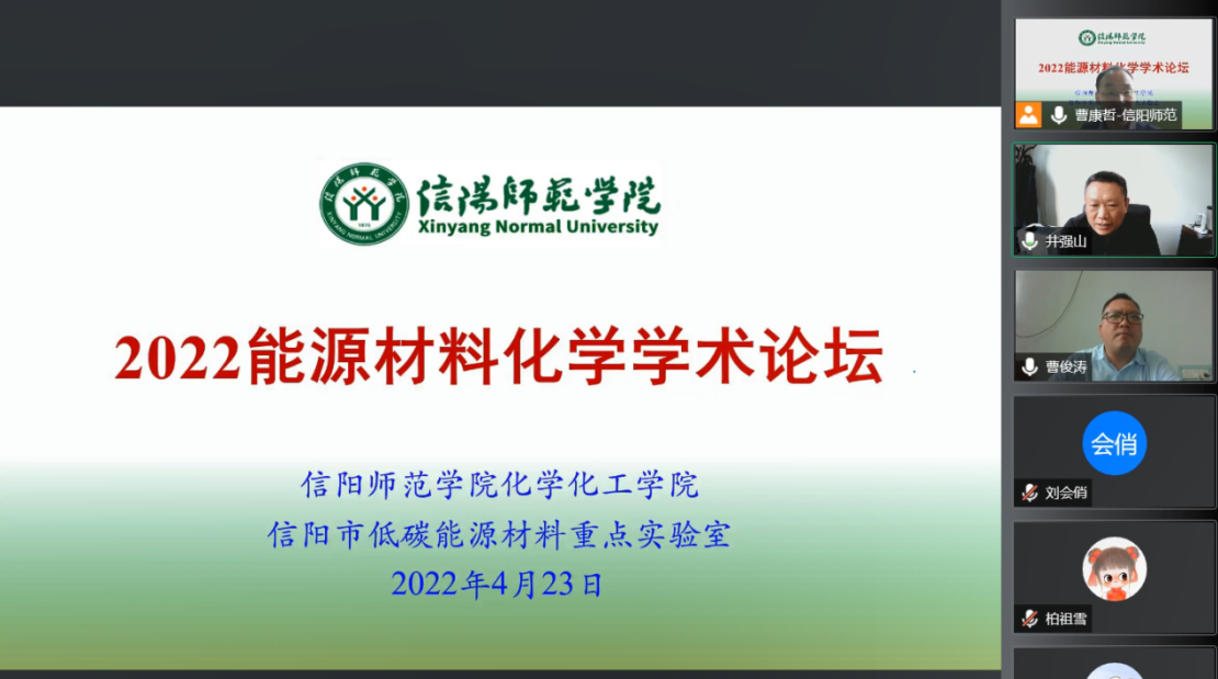 4月23日,由信阳师范学院ok138cn太阳集团529、信阳市低碳能源材料重点实验室承办的“2022能源材料化学学术论坛”线上会议成功召开,我校科技处处长兼ok138cn太阳集团529院长井强山教授做开幕致辞,来自南开大学、清华大学深研院等高校和研究院所的10位业内顶尖学者做大会报告,我校近百名教师和学生参会。