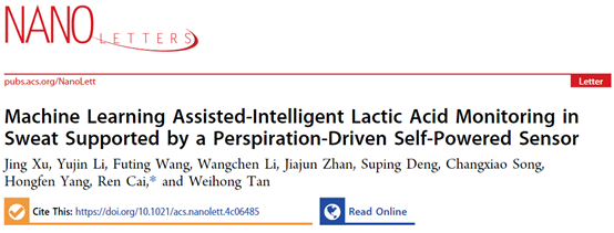 近日,我院许婧博士课题组在柔性可穿戴传感器研究领域取得了新进展,相关成果以“Machine Learning Assisted-Intelligent Lactic Acid Monitoring in Sweat Supported by a Perspiration-Driven Self-Powered Sensor.”为题,在国际知名期刊《Nano Letters》上发表。这项研究开发的智能汗液乳酸浓度监测传感器,通过合成乳酸氧化酶和丙酮酸氧化酶修饰的镍掺杂的金属有机框架(Ni-ZIF-8@LOx&POx)作为生物催化剂,以激光诱导石墨烯作为柔性电极材料,构建了一种高性能的酶生物燃料电池。该酶生物燃料电池结合微流道、无线传输元件和机器学习算法,实现了对汗液中乳酸的高灵敏度、高选择性的实时监测。该传感器不仅具有优异的性能指标,展示出其在个性化健康管理中的潜在应用。