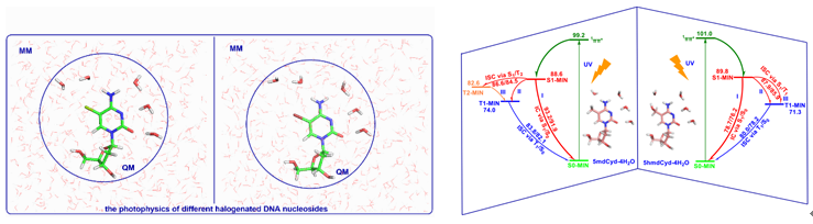 近日,我院常雪萍副教授课题组先后在期刊《Physical Chemistry Chemical Physics》和《The Journal of Physical Chemistry A》上分别发表了题为“Quantum mechanics/molecular mechanics studies on mechanistic photophysics of epigenetic C5-halogenated DNA nucleosides: 2′-deoxy-5-chlorocytidine and 2′-deoxy-5-bromocytidine in aqueous solution”、“Quantum Mechanics/Molecular Mechanics Studies on the Excited-State Relaxation Mechanisms of Cytidine Analogues: 2′-Deoxy-5-Methylcytidine and 2′-Deoxy-5-Hydroxymethylcytidine in Aqueous Solution”(DOI:10.1039/d4cp04574b; 10.1021/acs.jpca.4c08520)的研究成果。两项研究先后采用 QM(CASPT2//CASSCF)/MM理论方法计算研究了四种重要的2-脱氧-5-取代的胞苷类似物,即5-卤/溴胞苷(5CldCyd/5BrdCyd)和5-甲基/羟甲基胞苷(5mdCyd/5hmdCyd)在水溶液中的光物理机制,合理解释了其在水溶液中的激发态光动力学行为,为理解类似结构修饰DNA核苷及其衍生物的光物理和光化学机制提供了重要的机理见解。