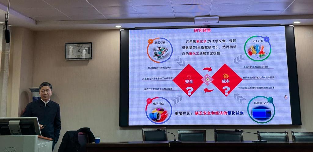 随后,易文斌教授为全院师生带来了一场题为“NaSO2CF3还原调控构建有机功能分子”的精彩学术报告。报告中,易文斌教授系统介绍了其团队利用NaSO2CF3作为氟源通过关键还原调控,在高效构建多样化、高附加值有机含氟功能分子领域取得的一系列创新性研究成果,深入阐述了其独特的反应机理与应用优势,展示了该策略在合成化学及功能材料领域的广阔前景。
