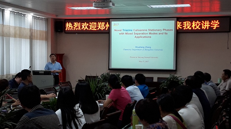 5月27日,应我校邀请,郑州大学现代分析与计算中心主任张书胜教授在化学楼学术报告厅作了题为“三嗪杯芳烃色谱固定相研究及其分析应用”和“郑州大学现代分析与计算中心创新运行机制”的学术报告,全体青年教师和研究生参加了报告会,报告会由ok138cn太阳集团529院长井强山教授主持。
