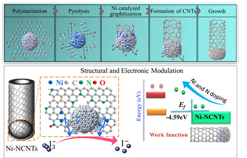 近日,我院陈明博士在国际著名学术期刊Chemistry of materials上发表了题为“Controlled Synthesis of Nickel Encapsulated into Nitrogen-Doped Carbon Nanotubes with Covalent Bonded Interfaces: the Structural and Electronic Modulation Strategy for Efficient Electrocatalyst in Dye-Sensitized Solar Cells”的研究论文。该论文主要报道了异质键合结构金属-氮-碳纳米管的新型合成方法及其作为染料敏化太阳能电池高效电催化剂的应用性能研究。相比传统的电弧与热解方法,该研究工作创新性地采用醋酸镍和三聚氰胺作为起始原料,利用金属镍催化碳纳米管顶端生长原理,在更低温度下简易有效地制备了金属镍、氮改性的多功能碳纳米管,且金属镍被包埋在碳纳米管内有效防止了镍纳米粒子的氧化、聚集以及腐蚀,同时又高效构建了金属-氮-碳共价的活性催化界面结构。此种设计合成的表面结构与电子改性的金属-氮-碳纳米管作为染料敏化太阳能电池对电极电催化剂,获得了相比贵金属铂对电极更高的催化性能与光电转换效率,化学稳定性更优。该新型碳纳米管制备方法简易,反应温度低,极易用于多功能金属-氮-碳纳米管的工业化生产,在电催化领域具有广阔的应用前景。Chemistry of materials是化学类一区期刊,影响因子9.466,在材料化学领域具有很高的影响力。论文链接:http://pubs.acs.org/doi/10.1021/acs.chemmater.7b03385
