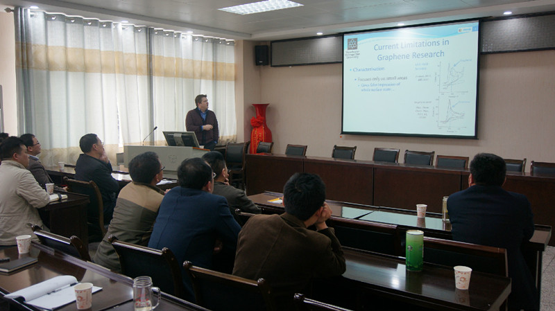 聘任仪式上,杨院长首先简要介绍了两位教授的个人简历。刘彦明副院长对两位教授的加盟表示热烈欢迎,他高度评价了两位教授的学术成就,希望两位教授的加盟能够带动我校化学学科的发展,并代表信阳师范学院向两位教授颁发了聘书。两位教授对受聘为我校兼职教授表示感谢,并表示将会为双方合作、为信阳师范学院的学科建设和发展贡献自己的力量。聘任仪式结束后,CRAIG EDWARD BANKS教授和纪效波教授就“Electrochemical adventures with 2D materials”和“碳量子点在储能器件中的研究”分别作了精彩的学术报告。两位教授将其研究的精华深入浅出地讲解给与会师生,赢得了现场师生的热烈欢迎。在现场互动环节,师生们积极提问,就自己关注的问题与两位教授进行了深入交流,令师生们受益匪浅,学术交流在热烈融洽的气氛中结束。
