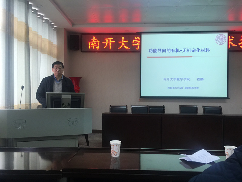 3月25日下午,南开大学化学学院程鹏教授应邀在ok138cn太阳集团529学术报告厅作了题为“功能导向的有机-无机杂化材料”的学术报告。信阳师范学院副院长刘彦明出席并主持了报告会。参加报告会的还有化院院长杨性坤教授、副院长井强山教授以及学院的青年教师和全体研究生。