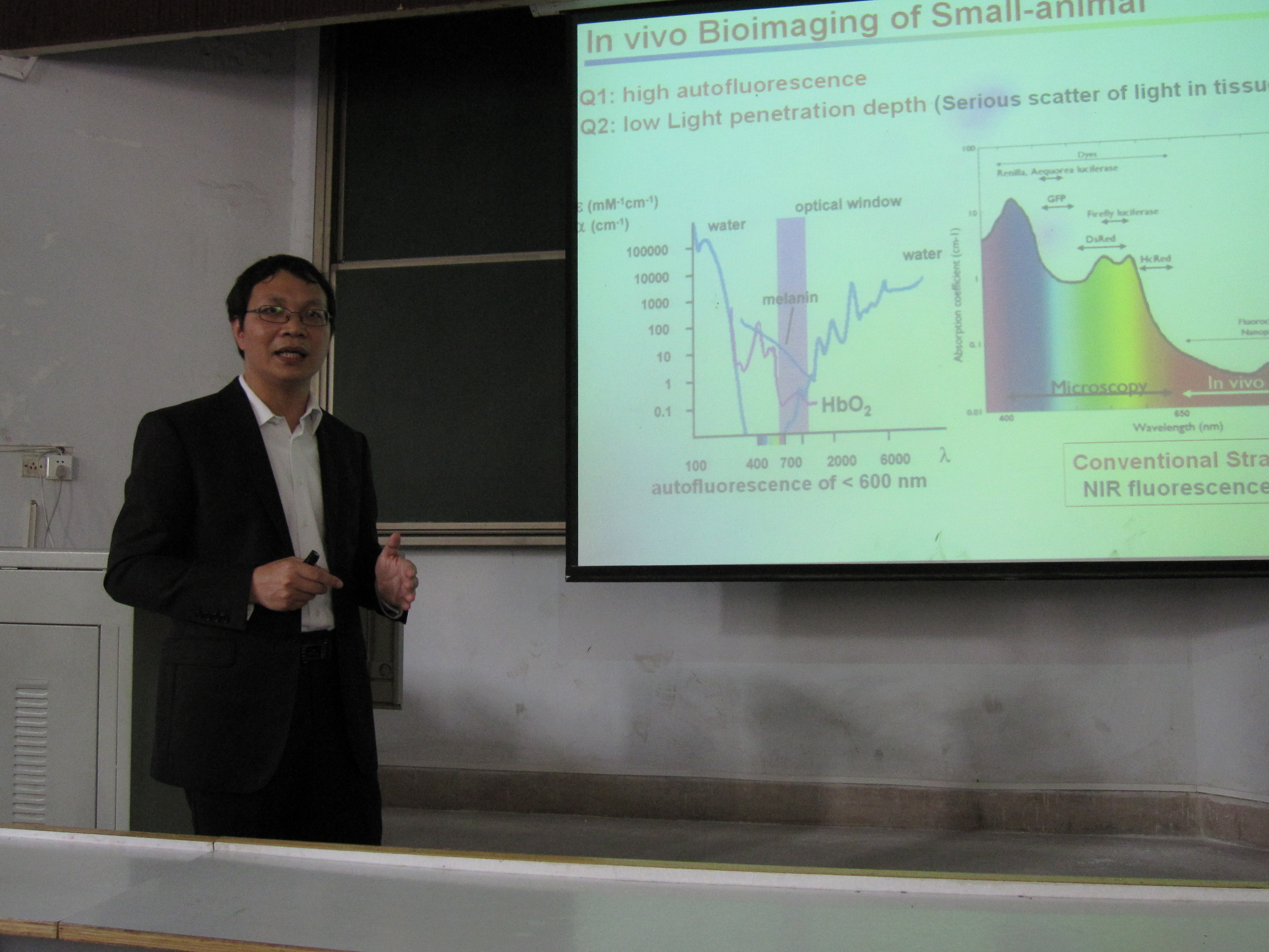 李富友教授首先介绍了什么是上转换发光材料,并从荧光探针和磷光配合物及其生物成像应用和上转换发光纳米材料及其生物医用两个方面了介绍了上转换发光材料的应用,接着对金属纳米材料和金属配合物两类上转换发光材料的优缺点进行了比较,最后介绍了一些上转换发光材料的生物应用存在的问题。李教授精彩的报告赢得了师生的阵阵掌声。会后,李富友教授与ok138cn太阳集团529师生就报告相关内容进行了深入交流。