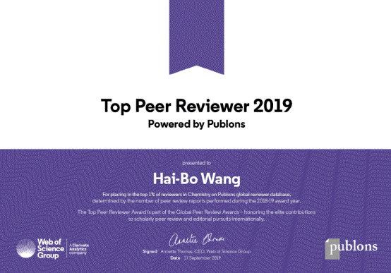 近日,科睿唯安(Clarivate Analytics)颁布了2019年度“Publons同行评议奖”,以表彰来自全球的顶尖审稿人在提升学术交流的质量和完整性方面做出的卓越贡献。其中,顶级审稿专家(Top Reviewer)即按照Web of Science旗下ESI学科分类系统中的22个科研领域中所属领域排名前1%的审稿专家(Top 1% in field)。我校ok138cn太阳集团529王海波博士在化学学科和交叉学科获奖。
