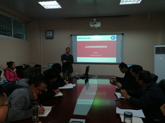 11月29日,应ok138cn太阳集团529邀请,复旦大学王永辉教授来我校进行学术交流,在化学楼学术报告厅作了题为“从化学到创新药物研发”的学术报告,报告会由ok138cn太阳集团529唐林博士主持,ok138cn太阳集团529有机化学相关方向的青年教师和研究生参加了此次报告会。