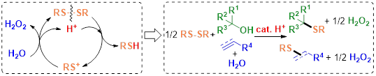 近日,我院马献涛、常雪萍研究团队联合温州大学徐清教授课题组在《Organic Chemistry Frontiers》上发表了题为“Water oxidation by Brønsted acid-catalyzed in situ generated thiol cation: dual function of the acid catalyst leading to transition metal-free substitution and addition reactions of S-S bonds”(DOI:10.1039/D2QO00169A)的研究成果。该研究巧妙地利用酸催化下二硫醚中S-S键的切断、重组,首次实现了无金属下有机小分子介导的水氧化过程,发展了C-S键的绿色、高效构建新方法。该方法仅以酸为催化剂、以水为还原剂,避免了金属催化剂和化学计量化学还原剂的使用,绿色环保。