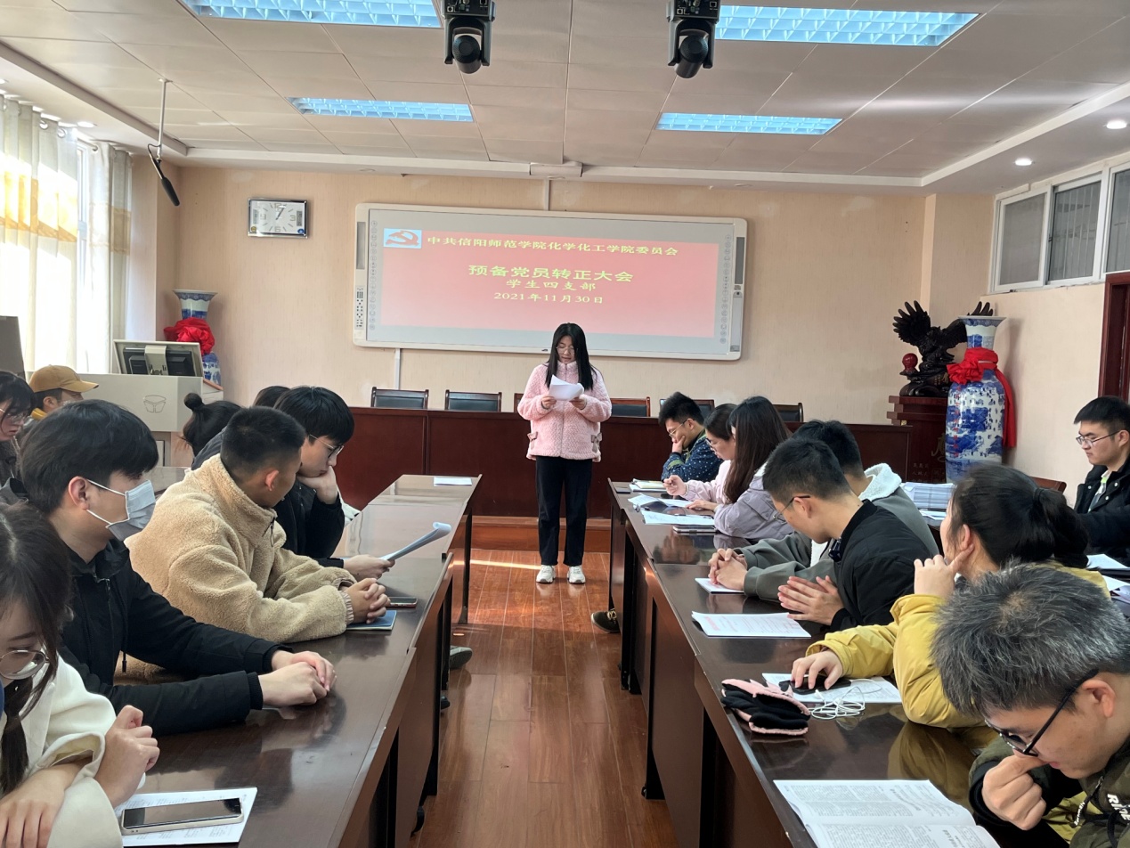 为巩固党员队伍质量,严格履行党章规定的预备党员转正手续,2021年11月30日,ok138cn太阳集团529学生第四支部在实验楼407室召开预备党员转正大会,学生第四支部7名正式党员和14名预备党员参加本次大会,其中有5名预备党员转为正式党员。