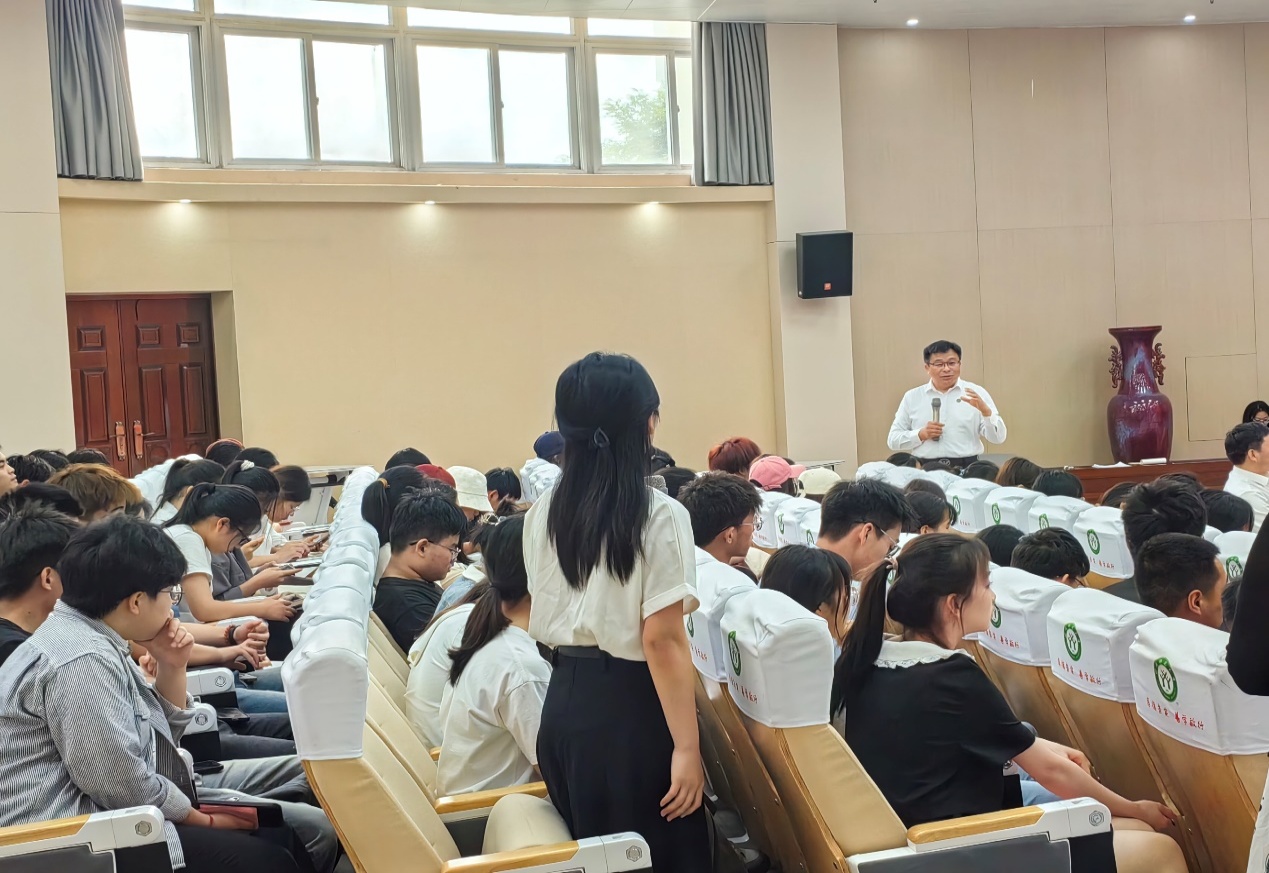 首先,邹亮忠结合自身求学、就业、创业丰富经历,为同学们讲解了化学学科发展的相关知识前沿、就业创业前景,强调了化学学科的重要性以及社会经济发展需求、相关专业人才的缺乏。他鼓励同学们要在大学四年生活中注重打好专业知识坚固基础,在日常学习生活中要有奋斗目标、要谦虚谨慎、要努力奋斗。其次,邹亮忠先生讲述了自身求学就业、创新创业的经历,并分享职场就业、创业人生一些经验:一是社会是有规则的,要积极适应社会;二是要提前了解自己热爱的职业并做好职业规划;三是坚持做好一件事力求有所成。接着,邹亮忠先生为大家分享自己关于求学和工作、做人和做事方面的独到人生见解。他提出“成功的标准是不给别人带来麻烦,作为一名大学生要做到独立,要有回报社会的感恩态度,要让别人因为我们的存在感到兴奋。”