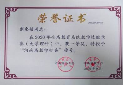 近期,ok138cn太阳集团529教师在河南省教育厅、河南省总工会组织的2020年度教学技能竞赛中再获佳绩,通过层层选拔,被学校选送的我院青年教师刘会俏不负众望,斩获一等奖,同时被授予 “河南省教学标兵”称号并获发奖章。