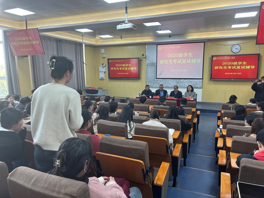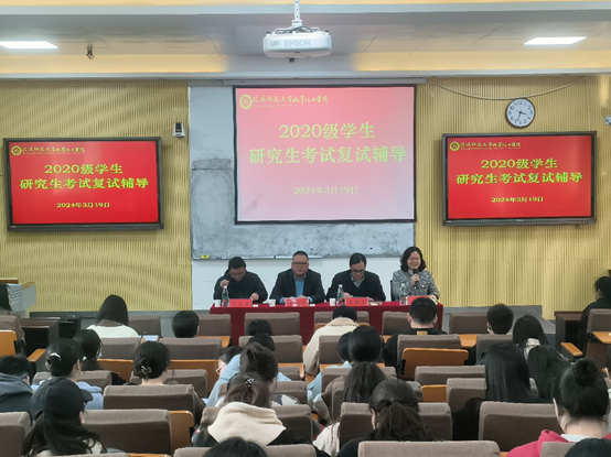 曹俊涛对考研学生进行全面指导,从复试心态、面试官的角度,详细讲解了复试注意事项,鼓励学生们要把握复试节奏,明确目标方向;王红军就复试前的准备工作、复试常见的问题,如本科阶段所选课程、调剂流程、调剂院校等方面给同学们做了系统讲解;于永生主要从学院的大型仪器设备、实验操作、实验技能等方面进行详细指导,表示要大胆心细,保持自信,争取优异成绩。在互动环节中,学生们积极讨论,并提问关于考研的相关疑惑,老师们对此给予详细的解答;曲剧进行总结,她鼓励同学们相信自己,自信从容面对此次考研复试,预祝在座的每位学子取得优异成绩。