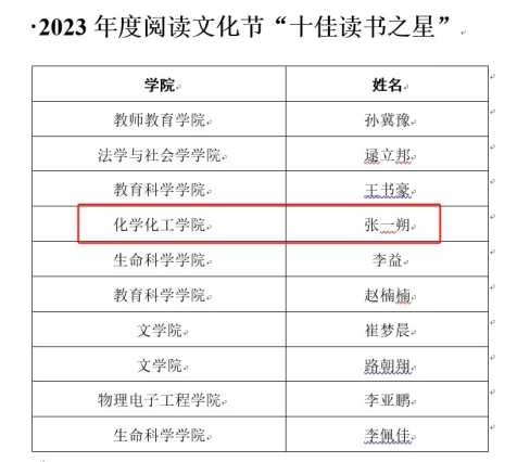 促进全民阅读,是赓续中华文脉、建设中华民族现代文明的重要举措。我院将充分结合学校阅读文化节的举措,鼓励学生静下心来阅读,沉下心来思考,潜下心来感悟,引导学生在阅读中长见识、树理想、悟生活、知人生,营造爱读书、读好书、善读书的浓厚氛围,以书香校园、书香社会建设为强国建设、民族复兴注入强大精神力量。(化学化工学院 翟成辉撰稿 曲剧审稿 郭鹏审核)
