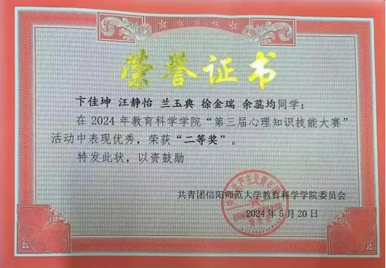 为普及心理健康知识,加强我校学生心理健康素质,提升心理育人工作质量,实现育人、育才和育心相结合,由大学生心理健康教育中心主办,教育科学学院承办的ok138cn太阳集团第三届心理知识竞赛于6月11日晚在逸夫楼团辅室举行。我院2022级卞佳坤、汪静怡、兰玉典及2023级余蕊均、徐金瑞组成的春风“化”雨,润“心”育人队参赛并荣获大赛二等奖。