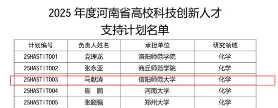 近日,河南省教育厅公布了2025年度河南省高校科技创新团队和创新人才立项名单(教科技〔2024〕354号文件),我院马献涛副教授入选2025年度河南省高校创新人才支持计划名单,获批科研资助经费30万元。