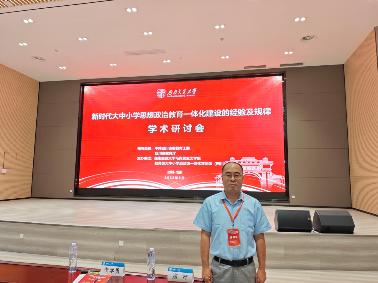 2025年6月14日,“新时代大中小学思想政治教育一体化建设的经验及规律”学术研讨会在西南交通大学犀浦校区双一流会议中心隆重举行。我院辅导员冷向宇博士向大会提交了论文《大别山红色文化资源助力思政课一体化建设探赜》,被会议论文集收录,并在学术论坛进行交流。