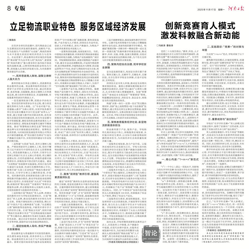 2025年11月17日,《河南日报》以《创新竞赛育人模式 激发科教融合新动能》为题,在第08版专题报道我院马献涛博士、曹俊涛教授团队的最新教研成果(报道链接:https://dzb.henandaily.cn/html5/2025-11/17/content_17_1767213.htm?curr=),充分彰显我院在基础学科创新人才培养领域的探索成效与示范价值。