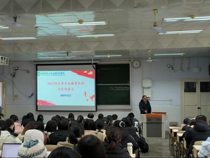 2025年12月23日,我院在教六101教室召开2023级化学专业教育实践工作动员部署会。学院副院长王红军出席会议并作动员部署,2023级化学专业全体200余名学生参加会议。会议旨在统一思想、明确任务,扎实推进教育实践环节,有效提升学生的教学实践能力与综合职业素养。