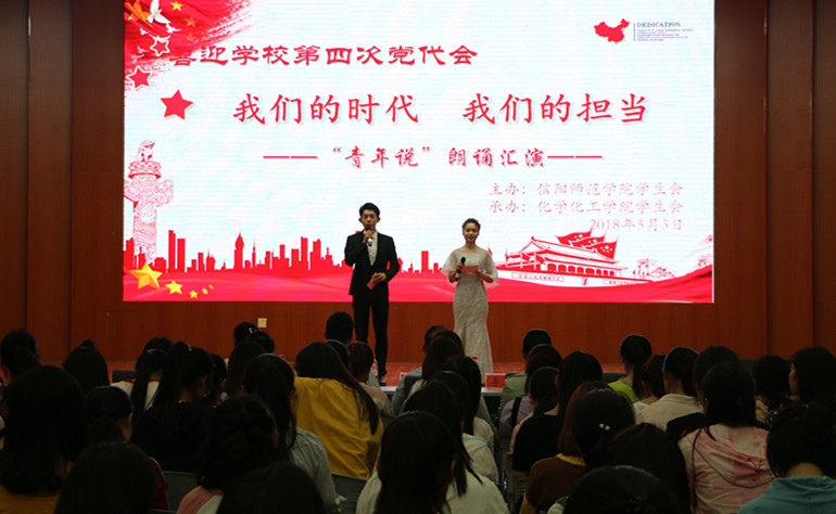 为喜迎信阳师范学院第四次党代会,传承五四精神,唱响中国梦,5月3日晚,ok138cn太阳集团529在逸夫楼报告厅隆重举办“我们的时代 我们的担当”朗诵汇演。校党委宣传部、学生处、校团委以及ok138cn太阳集团529相关负责同志与来自8个学院的五百余名学生参加了此次活动。