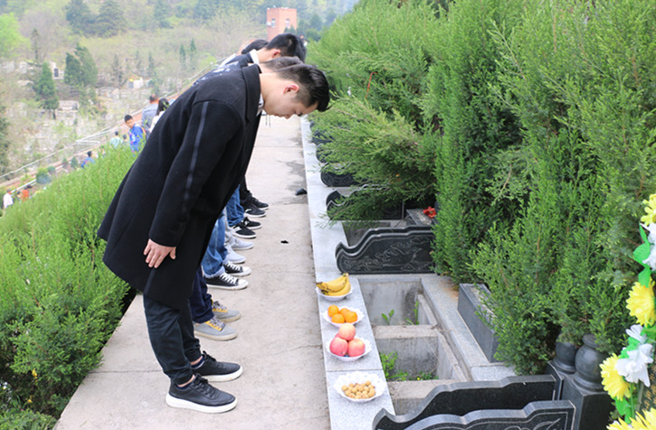 到达烈士碑位后,同学们首先认真地为烈士清扫了碑位,诚挚地献上鲜花和水果,并为烈士深深鞠躬静静默哀,借此表达对革命先烈的敬意、哀思和怀念。墓碑旁的松树苍翠茂盛,这都是先烈们抛头颅洒热血换来的祥和安宁。