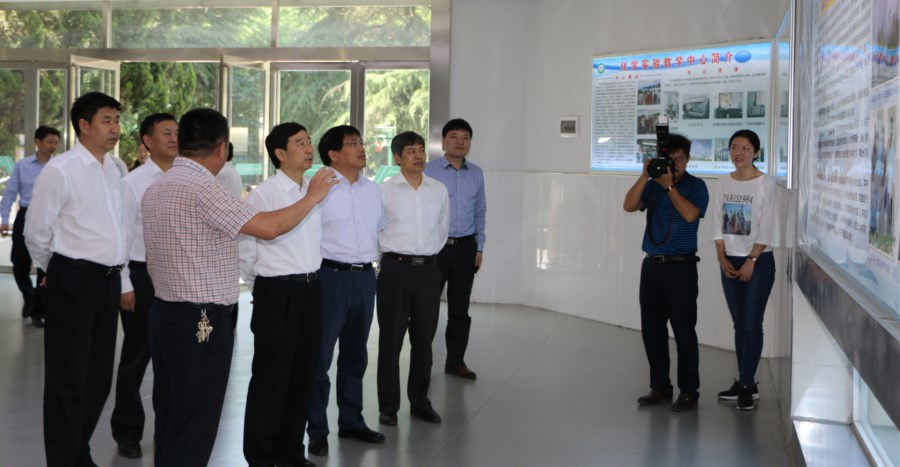 5月17日上午,信阳市委书记乔新江、市委秘书长王新会、市直有关部(局、委)负责人等一行30余人,在信阳师范学院党委书记宋争辉、校长李俊陪同下,莅临信阳师范学院ok138cn太阳集团529考察指导。各级领导一行分别到ok138cn太阳集团529豫南非金属矿物资源高效利用重点实验室、信阳市非金属材料展馆等实验设备场所考察指导工作,副校长齐城、陈登报等领导同志一起随同考察,ok138cn太阳集团529党委书记郭鹏、院长井强山、非金属材料研究所副所长刘鹏等领导陪同考察。