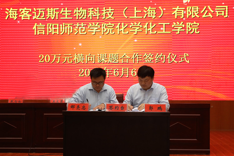 6月6日下午,信阳师范学院ok138cn太阳集团529与海客迈斯生物科技有限公司(上海)开展横向课题研发合作签约仪式在逸夫楼报告厅隆重举行,信阳师范学院副校长校长王文臣与海客迈斯生物科技有限公司(上海)总经理邹亮忠出席了签约仪式。招生就业处、学生处、校友办、ok138cn太阳集团529等单位的相关负责同志参加了仪式。仪式由校友办主任耿劲松主持。