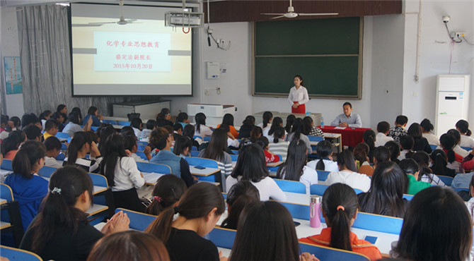 谆谆教诲育莘莘学子,声声叮咛树师者风范。为了提高新生的专业思想素质,正确规划未来的大学生活,10月20日下午三点,ok138cn太阳集团529于教四梯二隆重召开化学专业思想教育座谈会,副院长骆定法受邀担任主讲,一百四十余名新生参加本次座谈会。