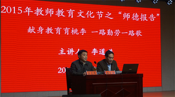 勤勤恳恳做人梯托起明天希望,兢兢业业为红烛照亮后辈前程。10月27日上午9点,ok138cn太阳集团529诚邀信阳市第九初级中学副校长李道祥为我校学子作“班级管理有智慧,心泉浇开桃李花”为主题的师德报告会。ok138cn太阳集团529团总支老师李中杰以及近千余名师院学子聆听了此次报告会。化院副院长骆定法担任报告会主持人。