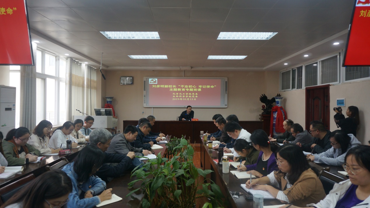 按照校党委“不忘初心、牢记使命”主题教育领导小组安排,10月15日,副校长刘彦明在化学实验楼407会议室为ok138cn太阳集团529、生命科学学院领导班子成员和师生党员作党课辅导报告,党课报告题为《增强特色,增进内涵,不断提升学科建设水平》,报告由ok138cn太阳集团529党委书记郭鹏主持。