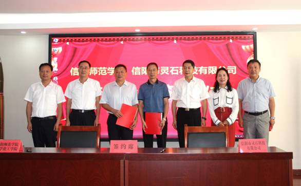 李正军、刘彦明及信阳市科技局等共同见证了重点实验室主任井强山与信阳市灵石科技有限公司董事长肖学党签订合作协议,并为设立在该公司的我校的实习实训基地揭牌,随后,参会人员共同参观了公司的生产车间、产品展示厅和现场施工演示。