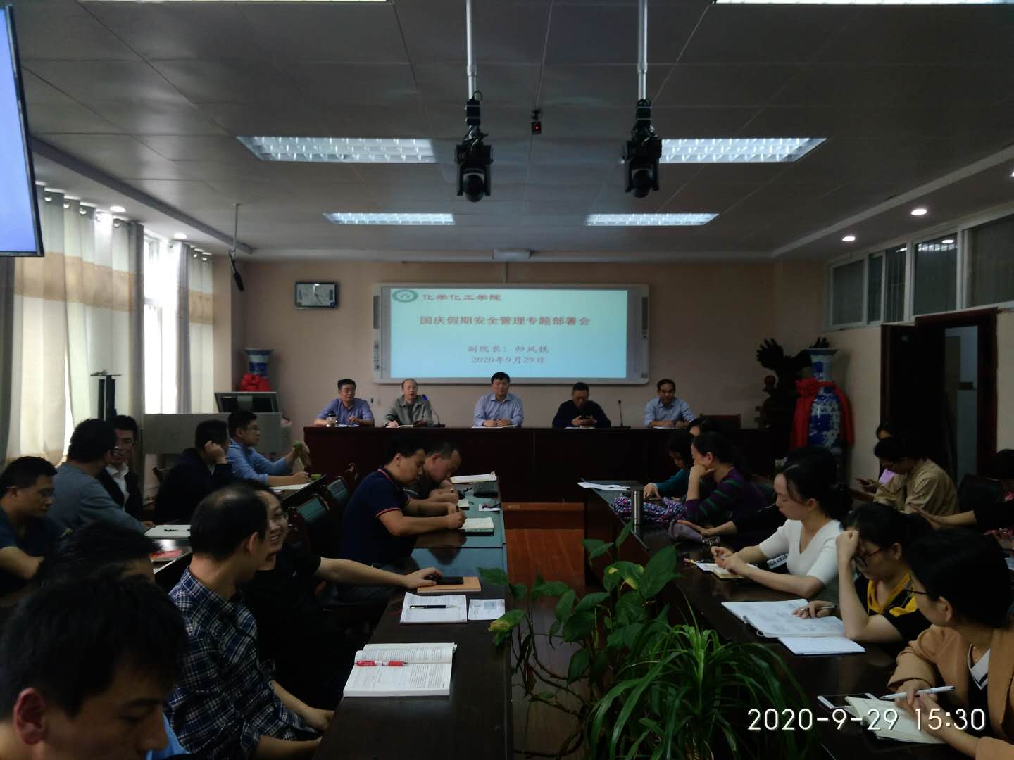 会上,分管领导归风铁副院长详细安排部署了国庆节期间安全稳定、实验室管理、应急值班、外出登记报备等具体工作。全体教师要时时处处关注安全管理,全体学生时时处处遵守安全规则,共同营造平安和谐喜庆的氛围,一时一刻也不能放松警惕意识,要确保各方面安全稳定,以优异成绩喜迎新中国成立71周年。(ok138cn太阳集团529 冷向宇、于永生供稿审稿 郭鹏审核)