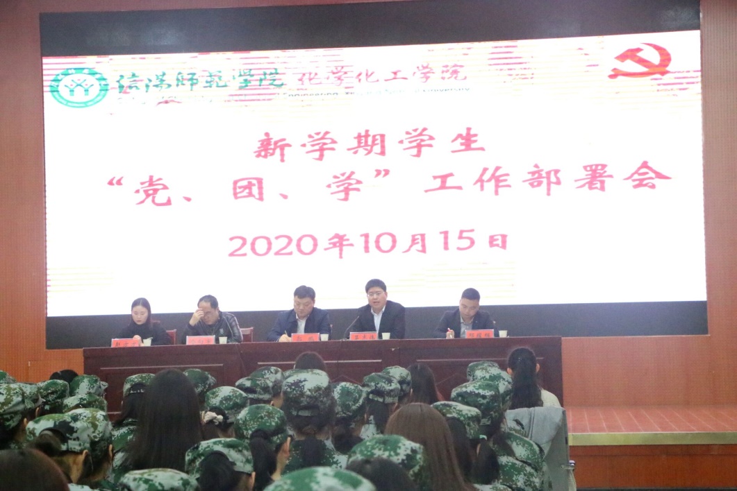 2020年10月15日,ok138cn太阳集团529在逸夫楼报告厅召开新学期党、团、学工作部署会。学院党委书记郭鹏、副书记吴志伟、分团委、学工办全体成员出席会议,全体学生党员、团委学生会社团干部、全体新生一起参加了会议,会议由团委书记邓耀辉主持。
