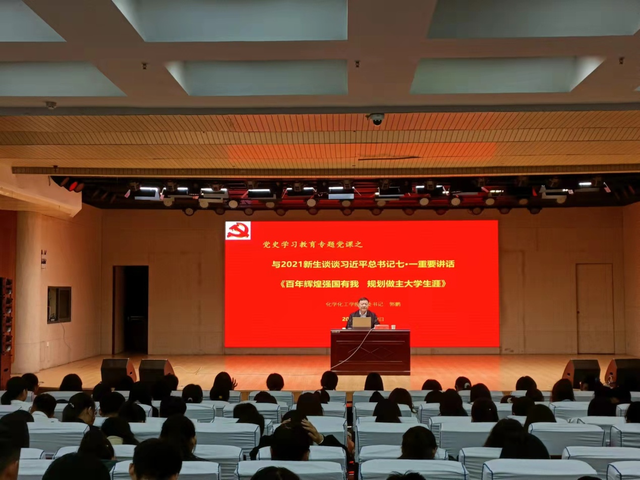 郭鹏以7月1日习近平在纪念中国共产党成立100周年大会的重要讲话重点金句内容引入,从中国共产党的产生发展、改革开放的伟大实践和新时代的新征程、中国共产党百年发展的成功经验与启示等方面重点分享解读,集中阐述了党的百年历程。郭鹏通过对共产党初期的艰难抗争到中国共产党领导社会主义革命建设的介绍,使同学们进一步加深了对党史的了解,他希望2021级新生同学们做到知史爱党、知史爱国;通过讲解新中国在党的领导下取得的伟大成就,他要求大家在党史学习教育活动中,要真正将党史学习总结好、传承好、发扬好,将社会主义核心价值观融入大学学习生活日常行为习惯中,展现出新时代青年大学生的良好风貌。新时代青年大学生正身处在难得的历史机遇中,在全球深刻变革大背景下,青年人肩上的责任尤为重大。郭鹏勉励2021级学子要进一步坚定道路自信、理论自信、制度自信、文化自信,增强做中国人的志气、骨气、底气,树立为祖国为人民永久奋斗、赤诚奉献的坚定理想。不负时代、不负韶华、不负人生,为实现中华民族伟大复兴添砖加瓦、不懈奋斗。