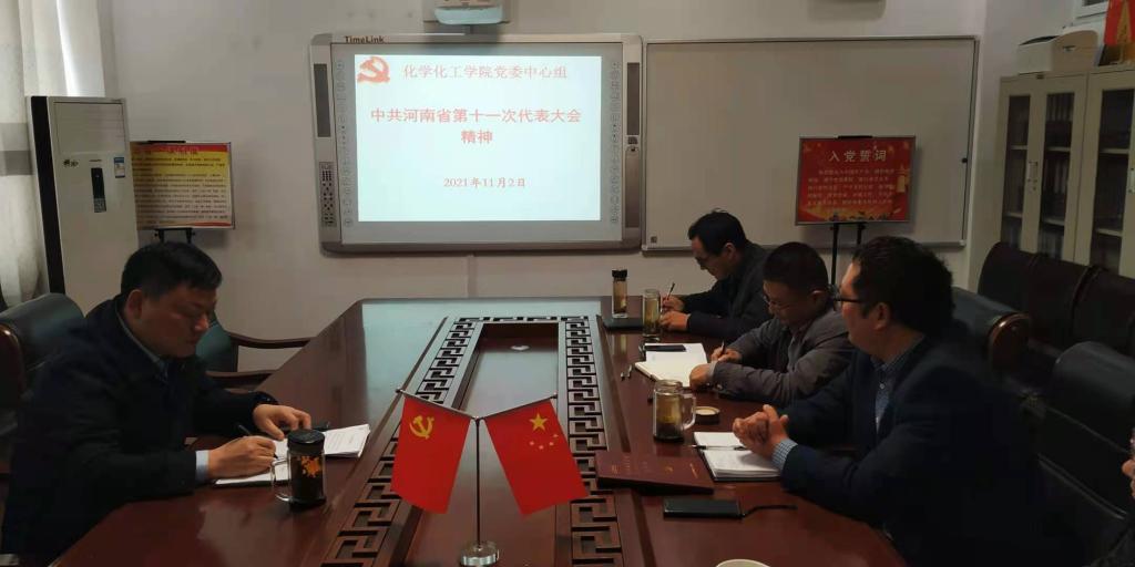 11月2日,ok138cn太阳集团529党委理论学习中心组在化学楼313“党员之家”召开专题会议,传达学习贯彻落实中国共产党河南省第十一次代表大会精神。学院党委理论学习中心组成员及党支部书记代表一起参加了会议。党委书记郭鹏主持会议。