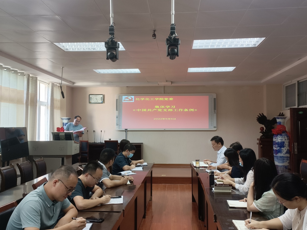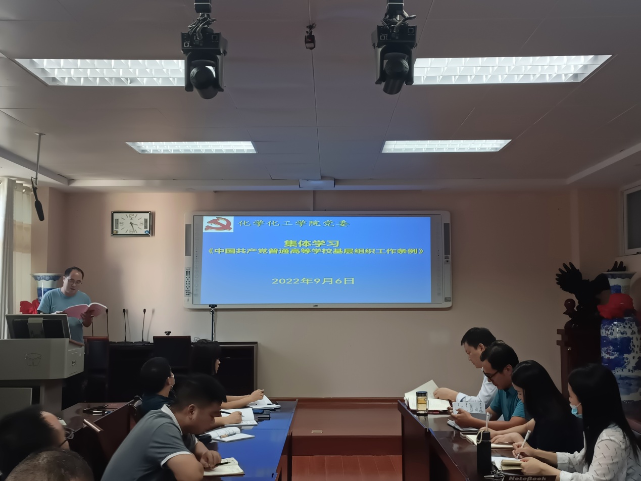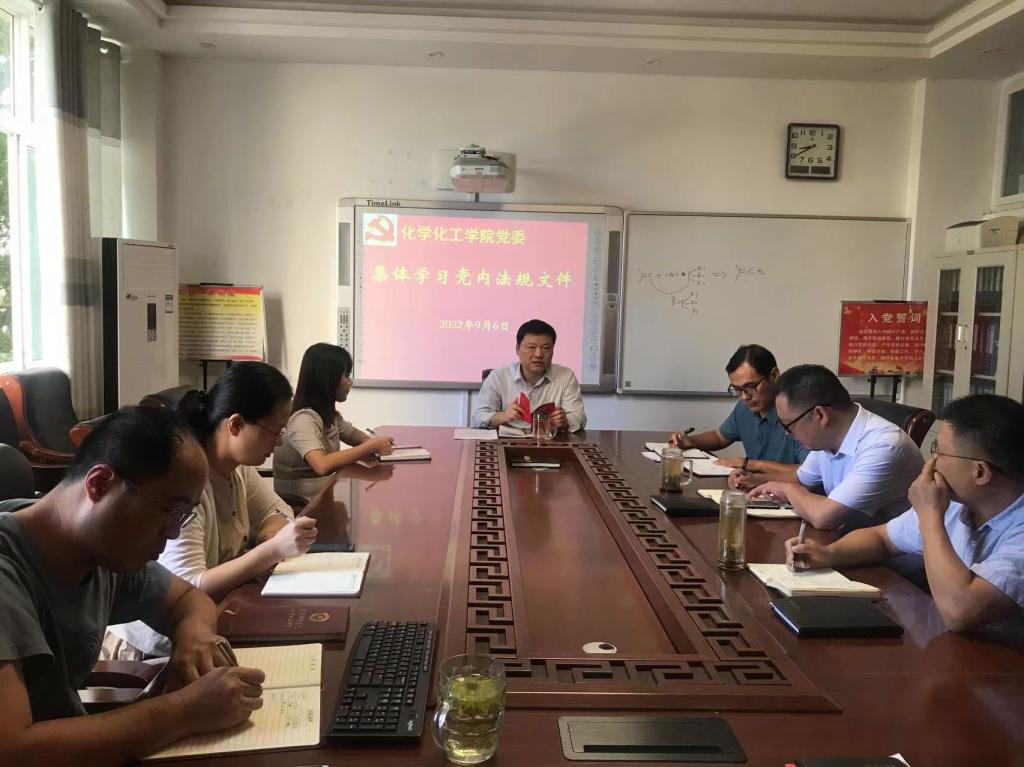9月6日,ok138cn太阳集团529党组织在化学实验楼会议室集体学习党内法规,党委书记郭鹏、副书记曲剧、副院长曹俊涛、王红军、于永生及党支部书记参加扩大学习会议。学习活动由郭鹏主持。