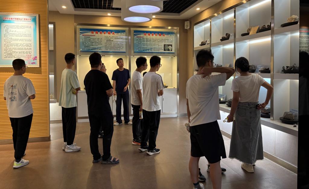 活动伊始,在讲解员的带领下,学生们参观了一楼的非金属矿科普展厅。展厅陈列有信阳地区重要的非金属矿原矿样品,如珍珠岩、膨润土、凝灰岩、沸石等,以及多种加工后形成的功能性制品。讲解员以生动通俗的语言,向学生们讲述这些矿物的成因、物理性质及其在建筑、环保、农业等领域中的广泛应用。面对这些“看似普通、实则宝贵”的矿物资源,学生们兴趣盎然,纷纷提问,现场互动频繁、气氛热烈。