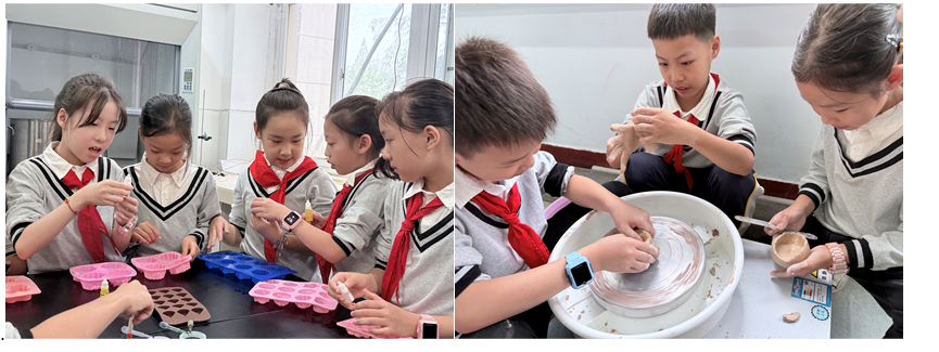 三楼的科普互动体验区,成为整场研学的“欢乐焦点”。在这里,孩子们化身“小小工匠”,在专业老师指导下亲手参与陶艺制作与香皂DIY。陶艺体验中,学生们揉捏黏土,或塑造精致的陶瓷碗,或创作独具个性的摆件,指尖翻飞间感受传统工艺的魅力;香皂制作环节,大家自由挑选香型与色彩,将调配好的原料倒入模具,不一会儿便完成了造型别致、色彩缤纷的手工香皂。家长们也不时在旁协助,有的帮忙递工具,有的和孩子一起调整黏土造型,亲子协作的画面格外温馨。